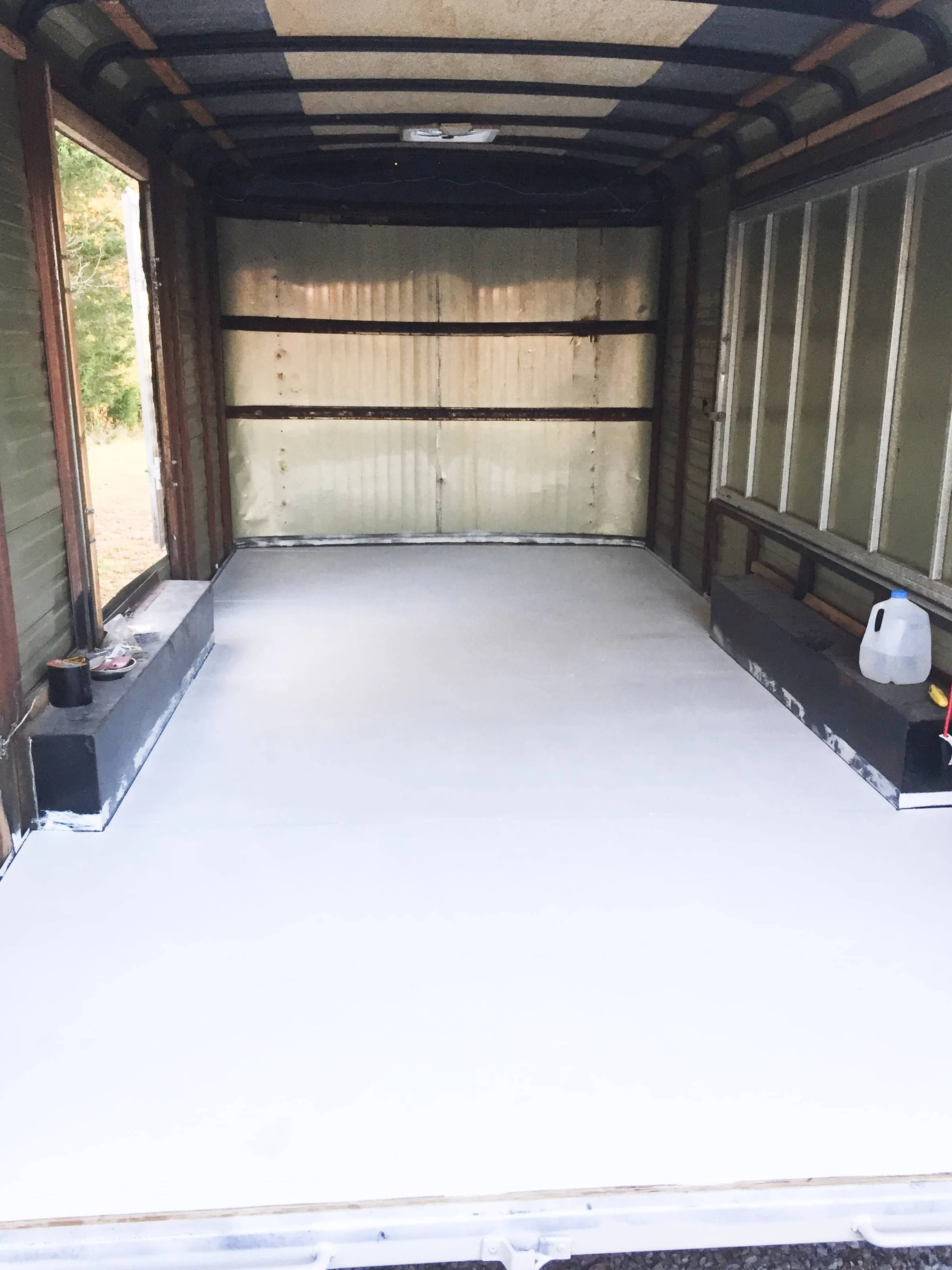 The final step for the floors was a paint finish. The cure time led to another bout of impatience. For the second coat, we knew we were teetering on the edge of prematurity so I decided to take my shoes off. I was paint-rolling my way towards the back door when my socks started to stick. Each step got a little worse and by the time I was halfway out, the floor stole my right sock. I decided it would be an inconvenient memento to leave and managed to extract it. Whether I was leaving my mark on the trailer or it was taking a bit of me is up for debate.