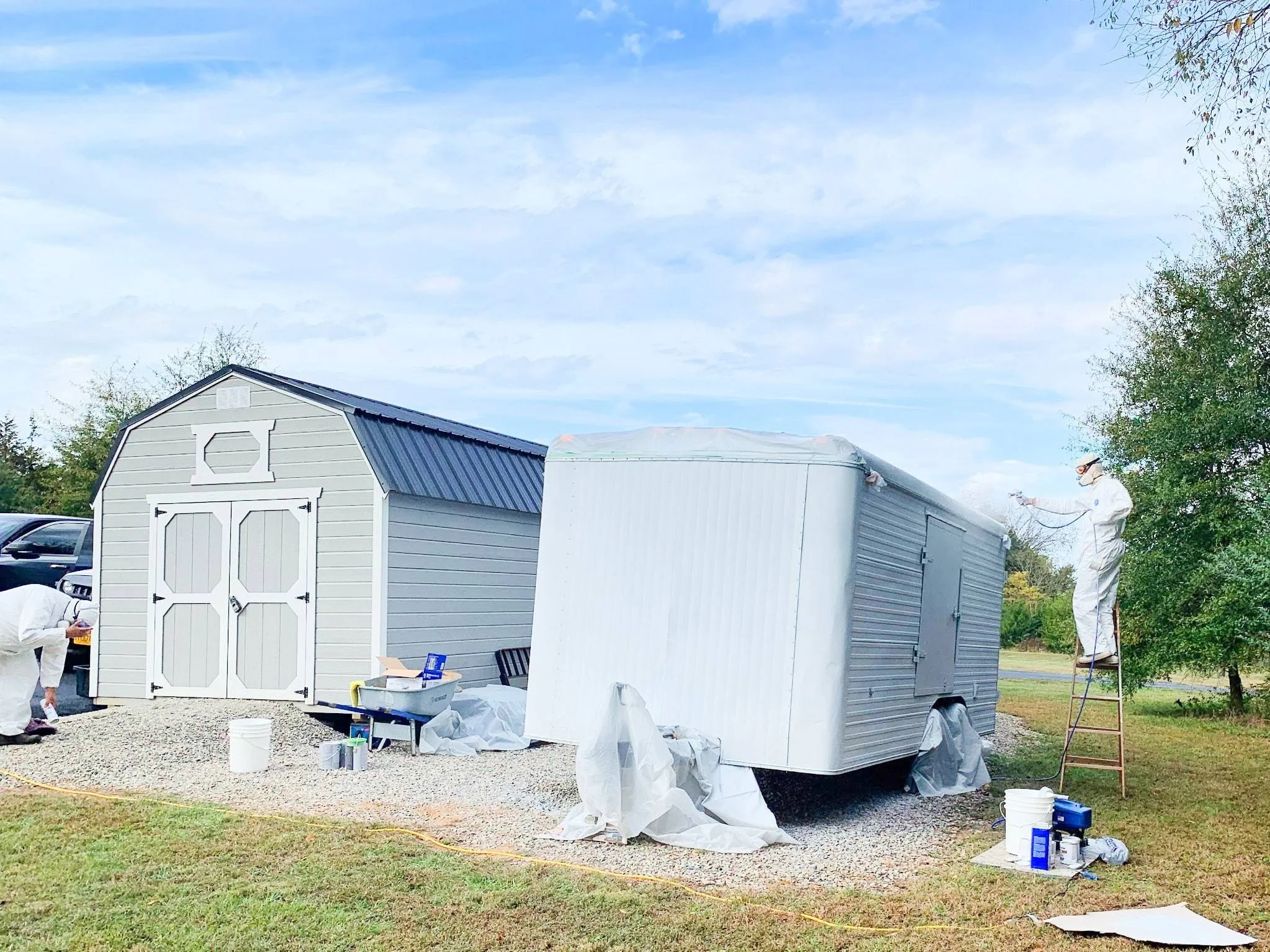 With primer, white, and blue to apply that meant six trips just for paint. Six commutes. Six times priming and then cleaning the paint sprayer. Six times suiting up, head to foot.